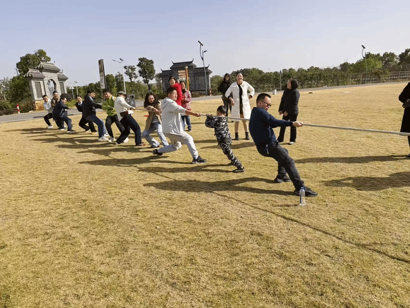 梁湖农庄三面环山、一面临湖,湖光山色相映成趣,清新雅致的生态环境让教职工们暂别案头忙碌,沉浸式感受自然野趣。活动以“经纬交织凝合力,同心致远共前行”为核心,精心设置了拔河、趣味协作等多元项目,既有力量的角逐,更有默契的比拼。拔河赛场之上,教职工们自发组队、并肩而立,紧握麻绳凝心聚力,呐喊助威声震云霄。随着哨声响起,大家脚蹬地面、腰背发力,每一寸绳标的移动都凝聚着团队的协作与坚持,平日里在讲台上传道授业、在实验室里潜心钻研的老师们,此刻化身并肩作战的战友,用汗水诠释团结的意义,用呐喊传递奋进的激情,赛场旁的加油声、欢呼声此起彼伏,温暖了整个初冬时光。
