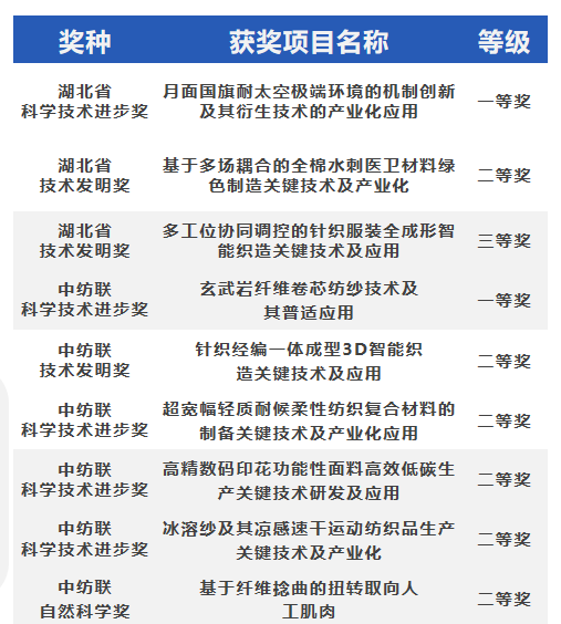 7.新增4门国家级一流课程、13项中纺联教学成果奖,教育教学喜结硕果。学院获批国家级一流课程4门,获批率100%,获批数量居全校第一;获评中国纺织工业联合会教学成果奖13项,其中特等奖2项,一等奖5项,二等奖6项,获奖总量创历史新高,获推荐申报湖北省教学成果奖2项。
