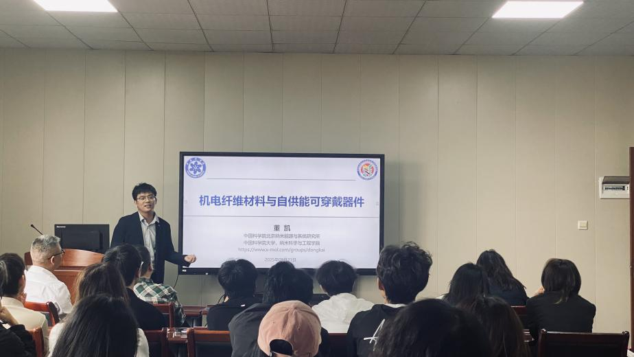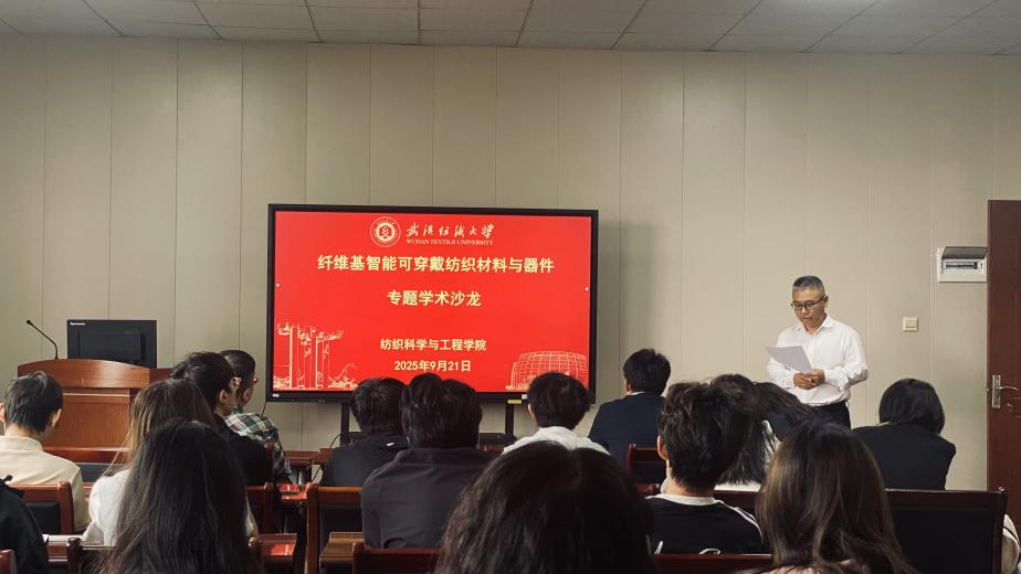 9月21日上午,由武汉纺织大学纺织科学与工程学院、纺织行业纱线及其功能化重点实验室联合主办的“纤维基智能可穿戴纺织材料与器件”专题学术沙龙在纺织科学与工程学院8H502会议室召开。中国科学院北京纳米能源与系统研究所董凯研究员、中国华中科技大学苏彬教授受邀参会并作学术报告,该沙龙活动由纺织科学与工程学院院长夏治刚主持,学院本科教学副院长柯薇、本科班(纺织(智能穿戴)12501)班主任罗磊及该班级全体本科生参加了本次沙龙活动。